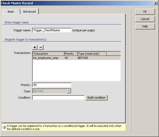 For instructions on completing this step, see the Advanced tab. For the Check Master Record trigger, by default the Priority is set to 40 and the Type is BEFORE (because checking if the master record exists must be done before the transaction).