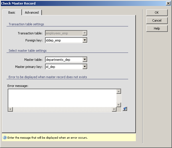 In the Error message text area enter the text to be displayed when the check fails, meaning that the master record does not exist. You can use the InterAKT Dynamic Data (the lighting bolt icon) to build the message.