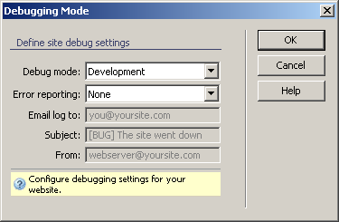 In the Debug mode drop-down menu, you can select the error handling mode. This is called the Debug Mode, since it actually helps track errors in the code. The available options are Development and Production.