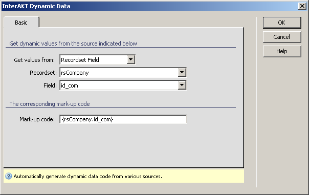 click on the InterAKT Dynamic Data icon, and configure the dialog box