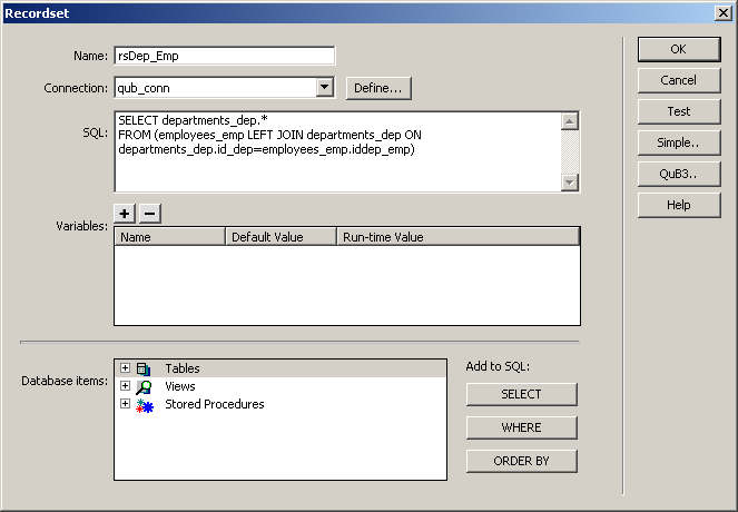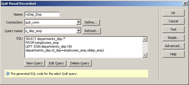 MX Query Builder recognizes and uses the database connections you define in Dreamweaver.