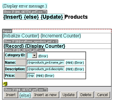 After the wizard configuration is finished, and the results are applied onto the page, several translators are shown in Dreamweaver's Design View. A translator is in fact visual aid corresponding to a code block behind the action, using simple to understand names (e.g. the Display error message translator is shown instead of the code that will display the error message - if any).