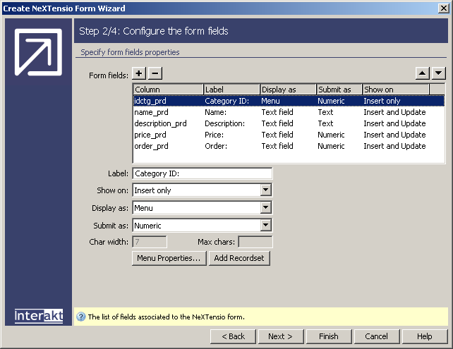 In order to create a form that allows performing insert and update operations on a given table, you can use the Create NeXTensio Form Wizard. It is a good pair to the NeXTensio list, as it can be used to perform multiple operations based on the existence of an URL parameter. The wizard adds all the elements needed in order to build a fully functional form that will perform all three operations: add, modify and remove records.