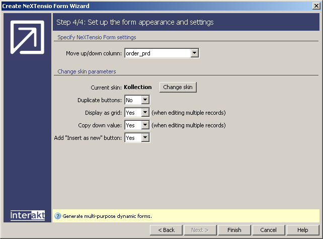 To change any of the form properties at a later time, you can double-click the NeXTensio Form Layout server behavior (inserted by the wizard) or apply the Manage NeXTensio Form Wizard command, accessed from the Insert bar -> MX Kollection tab.