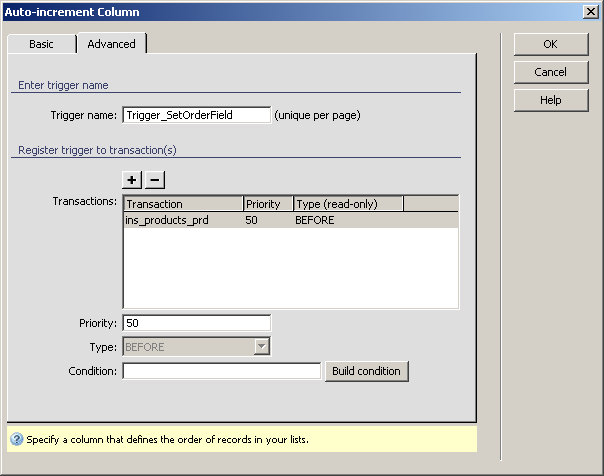 This server behavior is a trigger that registers itself to an Insert or a Custom transaction, automatically computing the value for the order column specified in its options. This value is computed by determining the maximum value already inserted, and adding 1 to it.