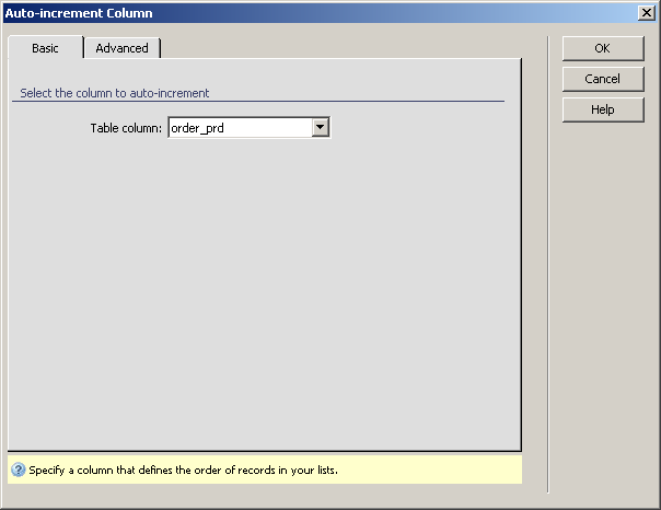 If building a form manually, or if you haven't selected a Move up/down column in the wizard, you can access this server behavior from the Application panel, Server Behaviors -> + -> MX Kollection -> Forms -> Advanced -> Auto-increment Column. The dialog box opens, containing two tabs.