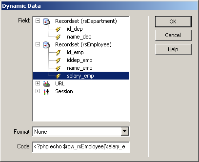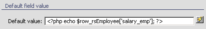 When you select a recordset field, or another variable through a Dynamic Data dialog, in the default Value text-box the actual code that will retrieve it is inserted, specific for the selected server model.
