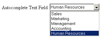 The Autocomplete Text Field replaces a regular text field in a form, and adds the autocomplete feature. Its behavior and look in a browser (with Java Script support) are as follows: