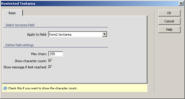 character count checkbox displays how many characters can
