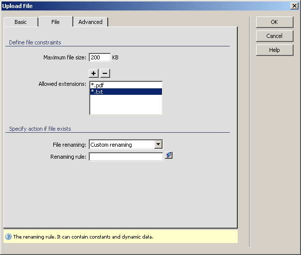 Access the trigger from the Application panel, Server Behaviors -> + -> MX Kollection -> File Upload -> Upload File. The user interface that opens is divided into three tabs. Configure them as shown below.