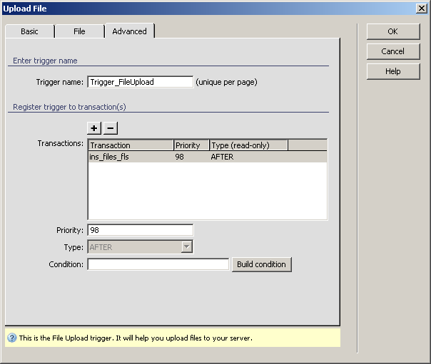 For instructions on completing this step, see the Advanced tab. For the Upload File trigger, by default the Priority is set to 98 (since the trigger works with files, it should be among the last ones on page, so a high priority number is recommended) and the Type is AFTER, as it should execute after the transaction was completed.