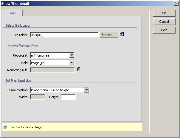 The Show Thumbnail server behavior allows you to display dynamic thumbnail images in your site pages. Before applying it, a recordset must be created in your Dreamweaver page. This recordset should contain the image/thumbnail names in one of its fields.