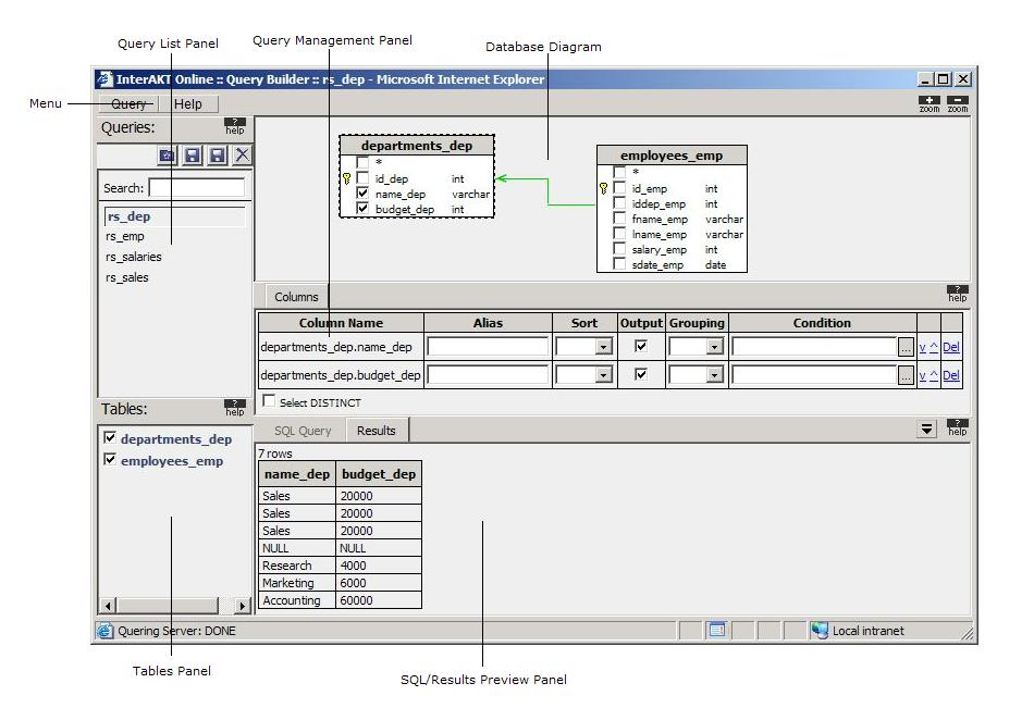 SQL/Results Preview Panel - this panel contains two tabs, one labeled SQL Query, and another labeled Results. These tabs let you see the SQL code, and its result, respectively.