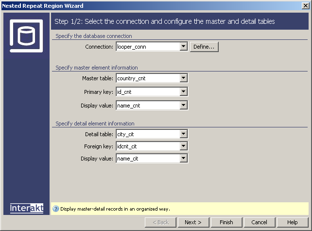 The Nested Repeat Region Wizard can display records from two related tables (master and detail tables) in an organized manner. The wizard uses the foreign key to determine which detail record belongs to which master record, and lists them accordingly.