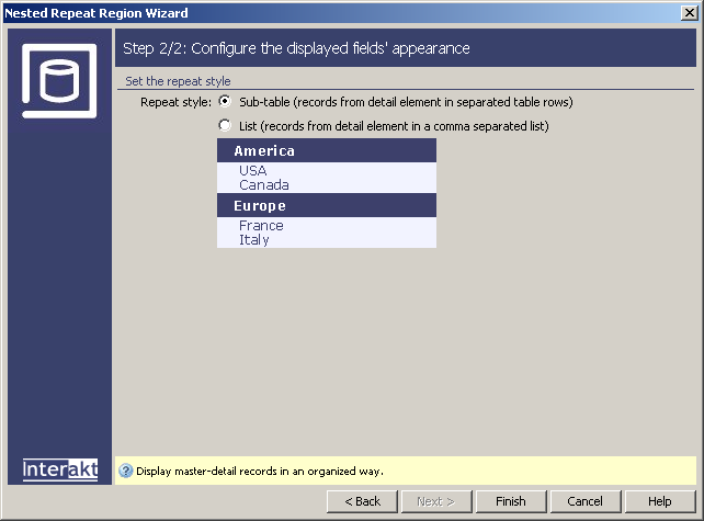 In the Repeat style radio group select the method by which the detail records will be displayed: List (comma-separated list) or Sub-table (tree-like structure).