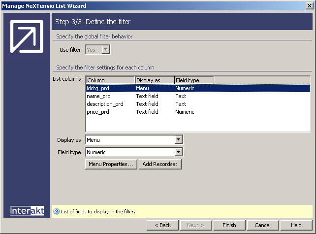 The Use filter drop-down menu is read-only, reminding you if you chose to use filters or not in the Create NeXTensio List Wizard.