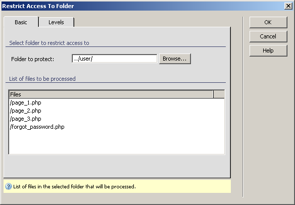 The end result of this command is similar to the Restrict Access To Page one, when viewed on a single page. The difference lies in the fact that this command applies itself to several pages at the same time. Only pages that have the same extension as required by the server model you're working on will be processed, and not all files in the respective folder (e.g. images, text files etc.).