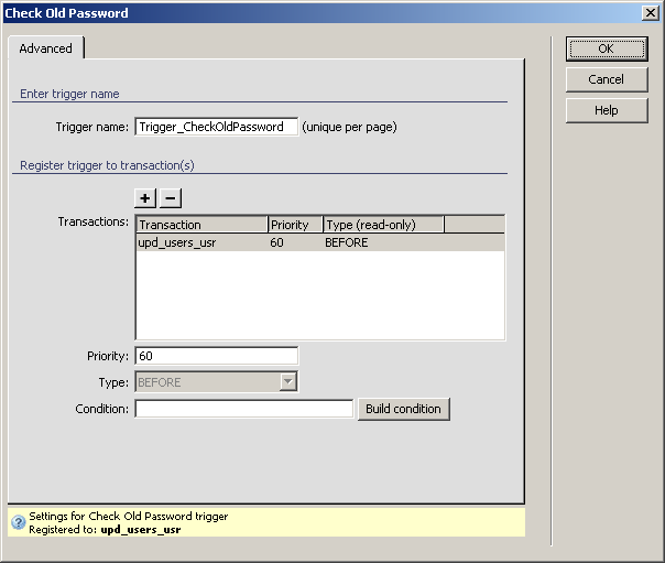 For instructions on completing this dialog box, see the Advanced tab. For the Check Old Password trigger, by default the Priority is set to 60 and the Type is BEFORE, as it should execute before the transaction takes place.