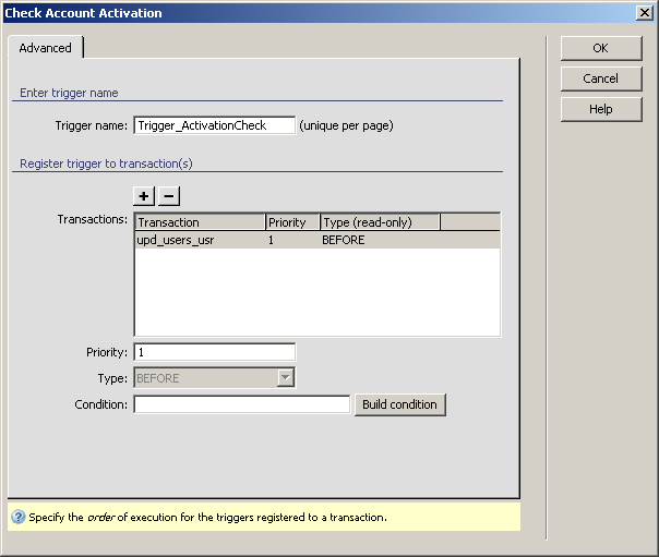 For instructions on completing this dialog box, see the Advanced tab. For the Check Account Activation trigger, by default the Priority is set to 1 and the Type is BEFORE, as it should execute before the transaction takes place.