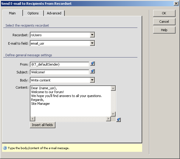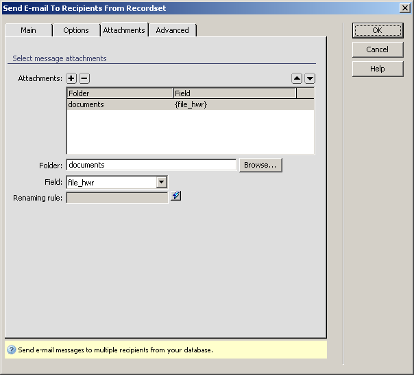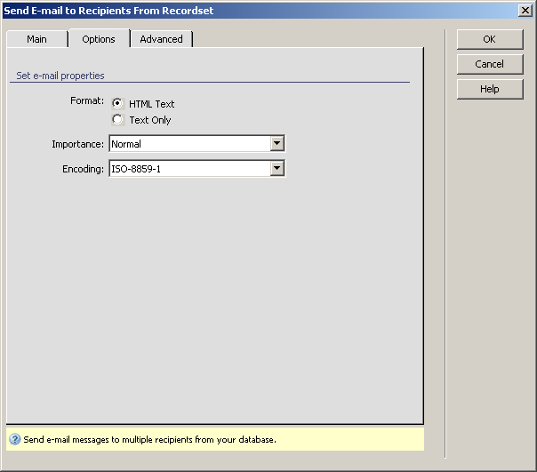 Note: The Send E-mail To Recipients From Recordset server behavior should not be used with large numbers of recipients, because you will not have perfect control over the mailing queue. Depending on your mail server configuration, the execution time might expire, if your mailing queue is very long. For a professional newsletter solution, we recommend MX Newsletter, which gives you perfect control over the mailing queues and has an optimized e-mail sending process.