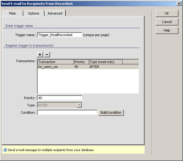 This trigger allows the site developer to send an e-mail message to multiple recipients when a form is submitted. By recipients, we understand the contacts (people, departments, companies) the site developer has, contacts whose e-mail addresses are stored in the database. The table column that contains the e-mail addresses will have to be included in a recordset before applying this trigger (thus the name of the trigger).