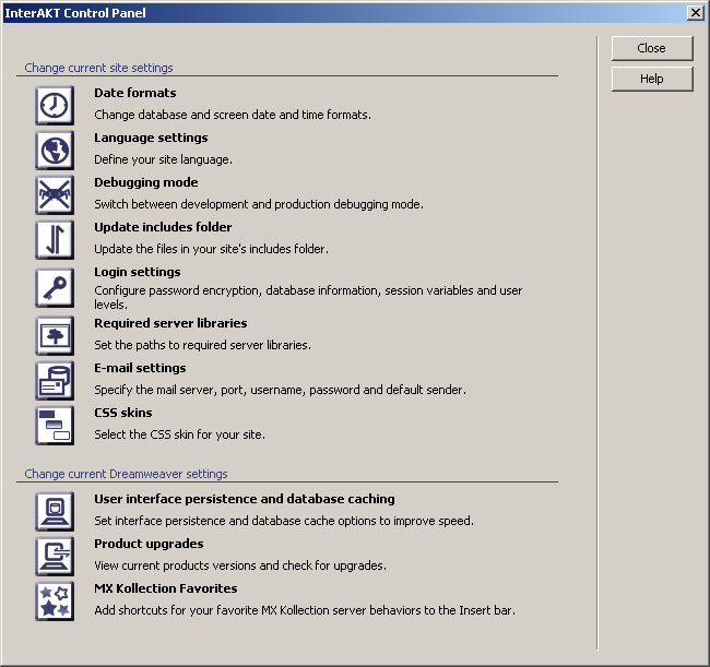 The control panel created for MX Kollection 3, namely the InterAKT Control Panel, is the central place for configuring the extension's behavior. This is also where you can update your products in a single place, or delete the database cache. The ImpAKT configuration is changed from here too, allowing you to set the development or production mode for your site, as well as deciding where to log error messages.