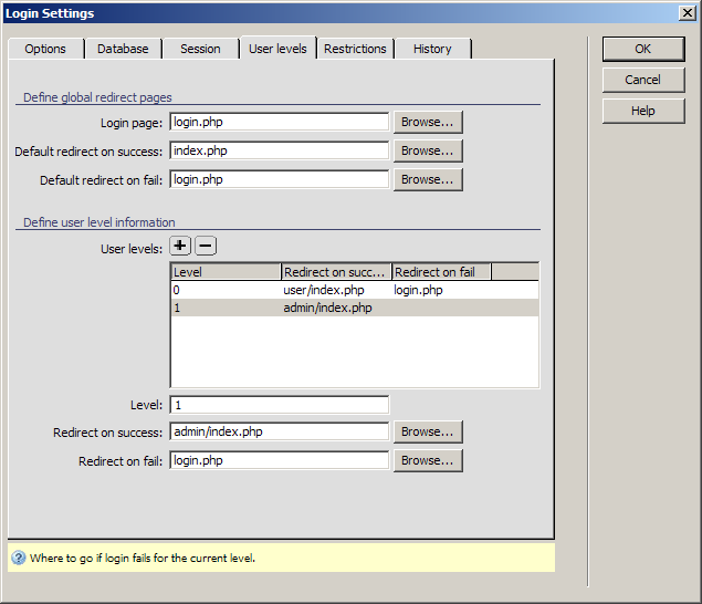 You can add or remove user levels through the buttons on top of the grid. To edit options for any of the user