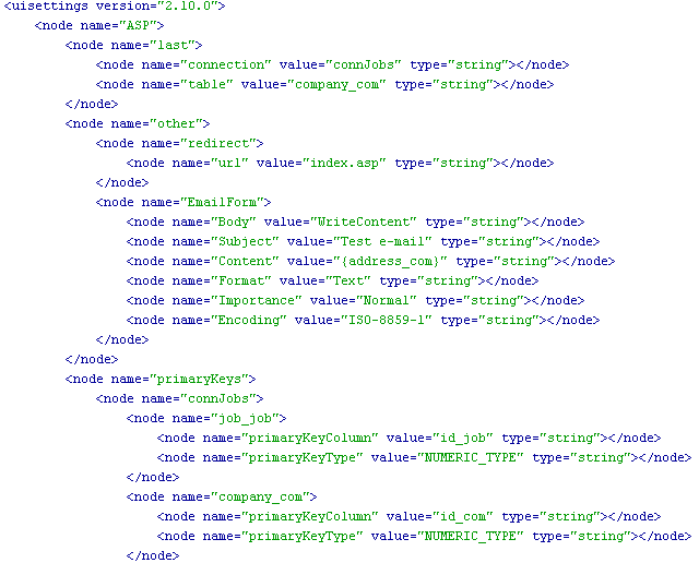 For each connection, the names of the tables involved are stored. For each table, column properties (label, display as and submit as elements) are saved as well.