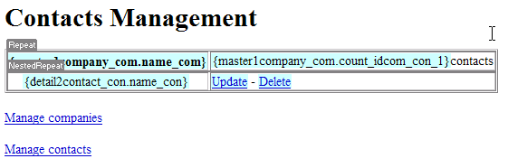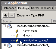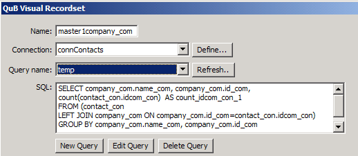 In this page you will use MX Query Builder to modify the main index.php page so that it will display the number of contacts per company. To get a count of a company's contacts, you will have to modify the master1company_com recordset, which was generated by the Nested Repeat Region server behavior.
