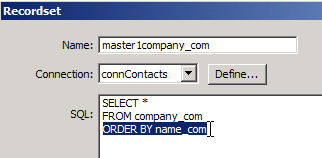 When the recordset window opens, remove the ORDER By name_com line from the SQL query. This step