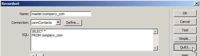 Now that the query is saved, you can close the MX Query Builder interface and go back into Dreamweaver. The QuB Visual Recordset window should still be open.