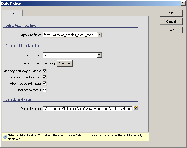 on page, and apply the DatePicker text field server behaviors, from the