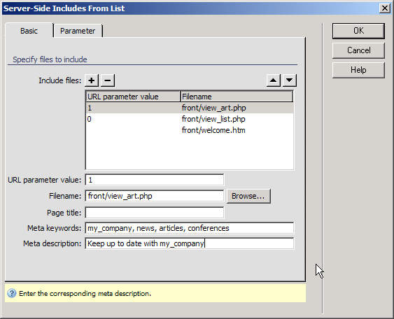 The Server Side Includes from List behavior from MX Includes lets you specify Meta data about your site.