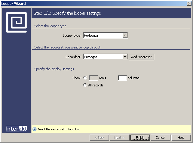 Create an unsorted recordset with all the records from the images_img table. The two previous tutorial topics (List images and show thumbnails and Delete Image) demonstrate how to create a recordset. You will use this recordset to extract the filename of the thumbnails, when applying the Show Thumbnail server behavior at the next step.