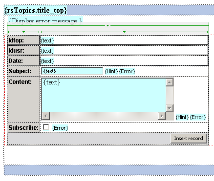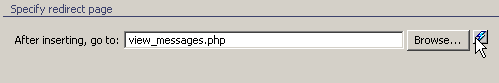 Next, click in the table's middle row. This is where you will place the actual form that takes user input and adds the message to the database. Launch Insert Record Form Wizard, from the MX Kollection tab of the Insert bar. The wizard will generate the form and the insert transaction for you. Configure it as described next.