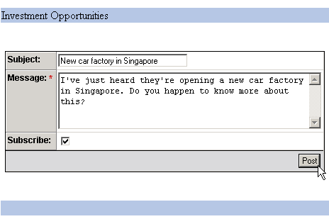 In this section of the tutorial, you will learn how to build the page that allows users post a new message in a certain topic. The page is accessed through the "Post message" link on the view_messages page, and passes to the post_message page the id_top URL parameter. This parameter contains the identifier of the topic to which the message will belong.