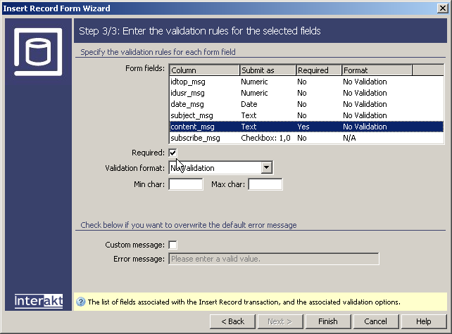 In Dreamweaver, the HTML form will be displayed in the table's second row, and the necessary server behaviors will be added to the Server Behaviors tab. If you need to edit any of them (the Insert transaction, or the Validation options), simply double-click their names in the tab and the dialog box will open.