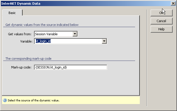 Dynamic Data window and select the session variable kt_login_id,