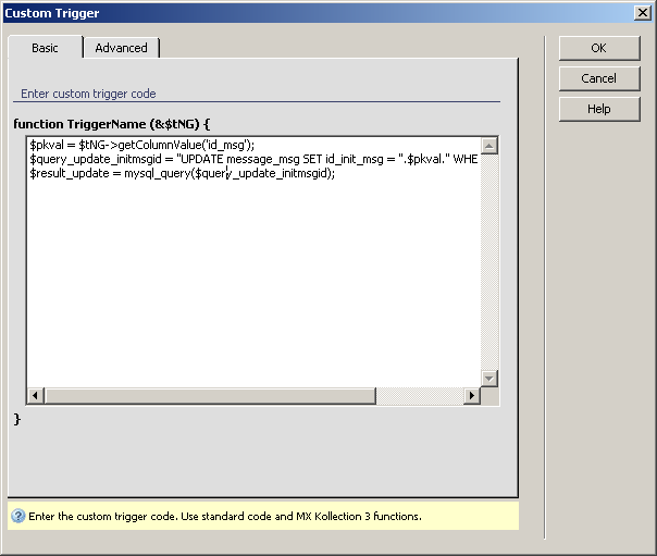 To create the Custom trigger that will update the value of the id_init_msg with the value of the primary key, follow the next steps: