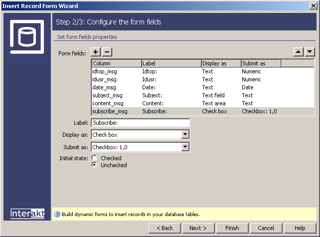of the Insert Record Form Wizard, which