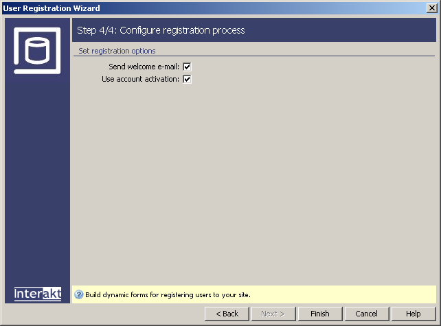 Start User Registration Wizard to create the registration page for job applicants (the register_user page). Follow the same steps as for the Company Registration, making sure you check the Use Activation option in the last step, along with the Send welcome e-mail option.
