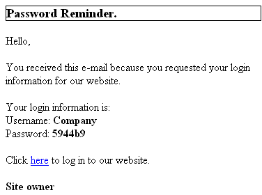 Now, if the user does not remember his password (for the site account), he can click on the I forgot my password link in the login page, and after entering the e-mail address in the respective text field, an e-mail message containing the old password (or a newly generated one) is dispatched.