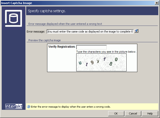 The wizard adds in the second row column a text field and a dynamic image. The image is generated on the server and the user will have to enter the code into the text field.