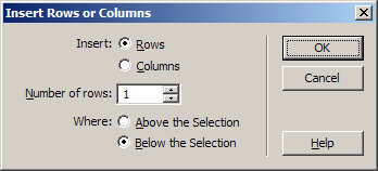Rows or Columns. Select to add a new row below the selection