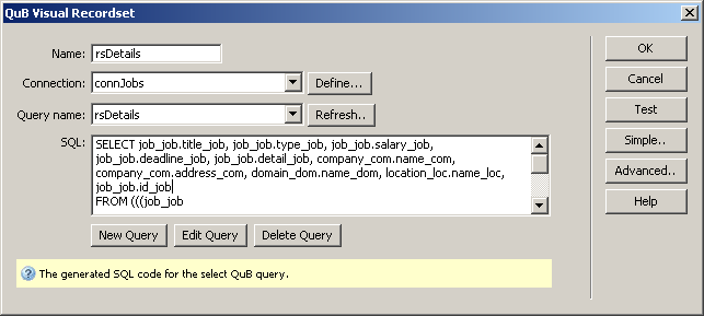 Dreamweaver MX Query Builder user interface will open. It provides options