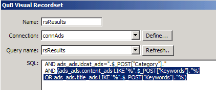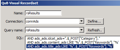 Now repeat steps 13 - 15 from the rsResults query to be able to use the new query in Dreamweaver.