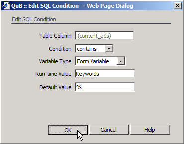 Condition. You will also use "Keywords" as the Run-time Value,