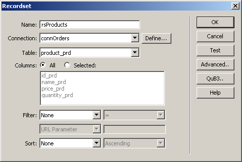 After you've set the new recordset options, click OK to add it to the page.