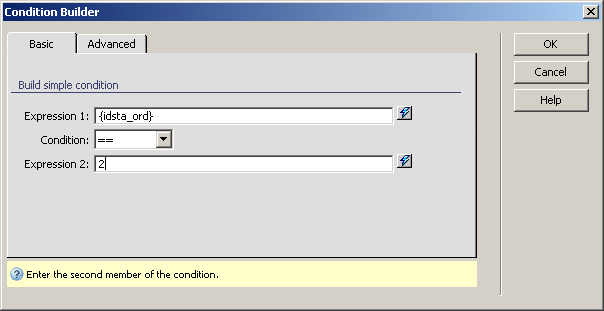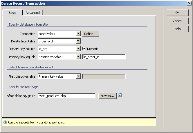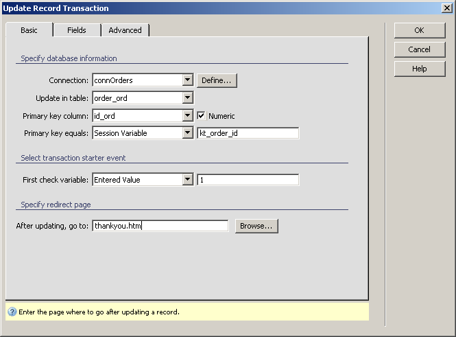 The dialog box is divided into three tabs, each addressing some options that can be set for the transaction. The Basic tab is where you must define general information regarding the database, starting condition and redirect page:
