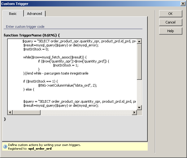Before writing the actual code, switch to the Advanced tab, and set the trigger type to BEFORE and the priority to 1. This is done because the quantity check must take place first on page.